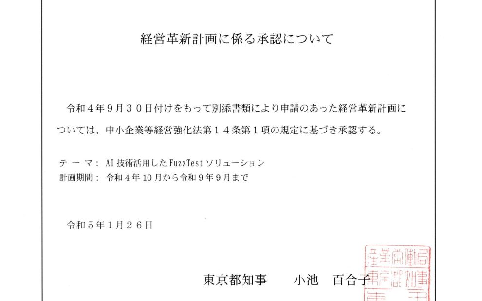 令和5年1月 東京都よりから「経営革新計…